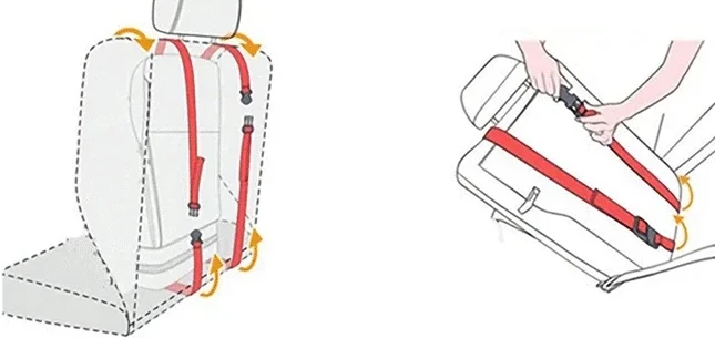 Open the seat that needs to be installed forward, pass the two webbings at the bottom of the seat from the lower end of the car seat. Then fasten the safety socket.