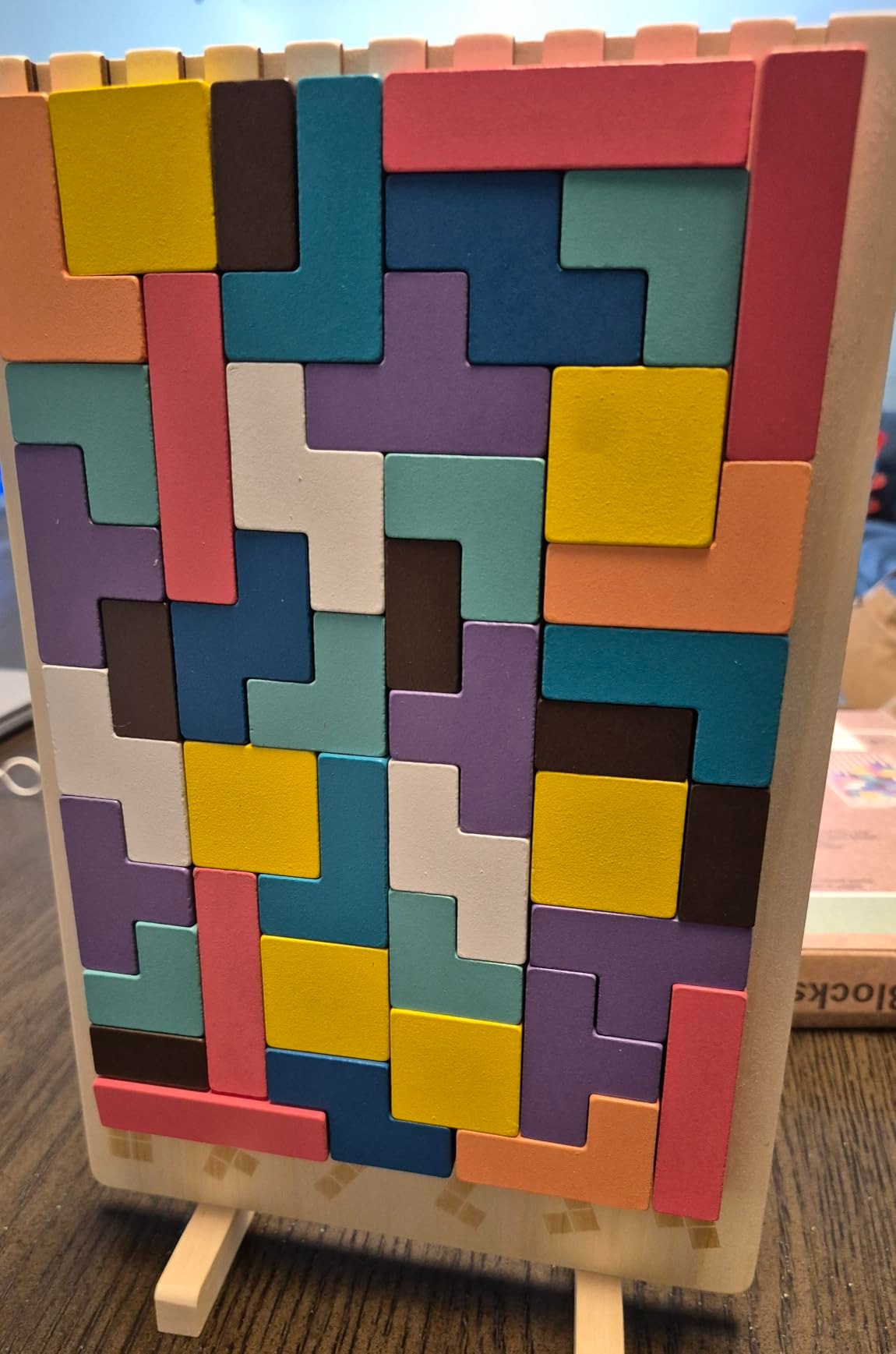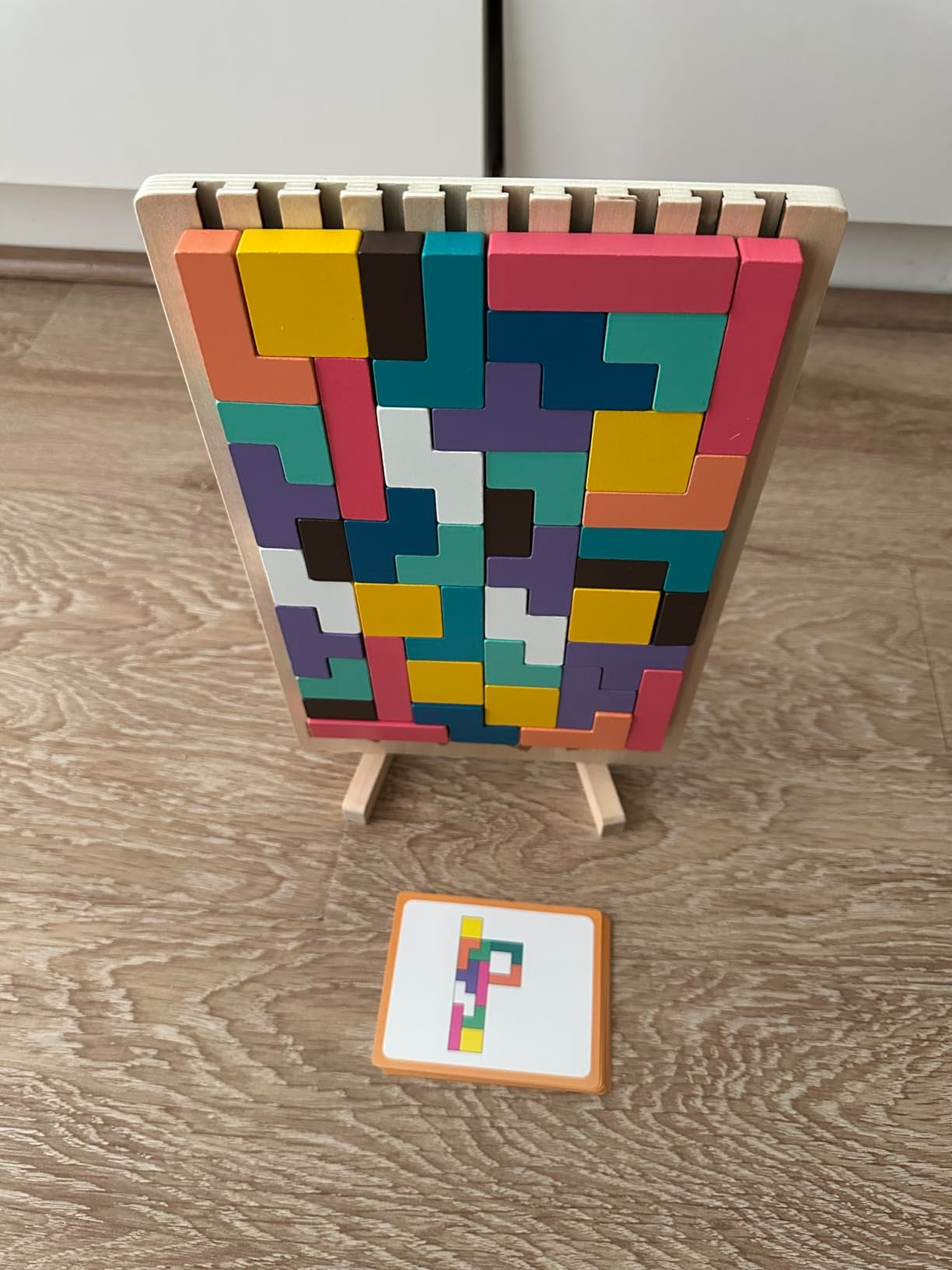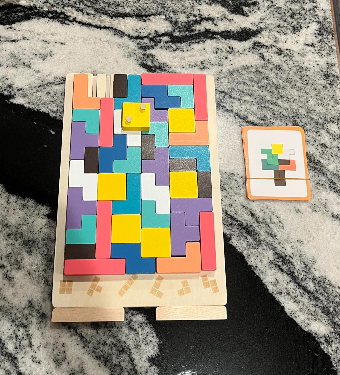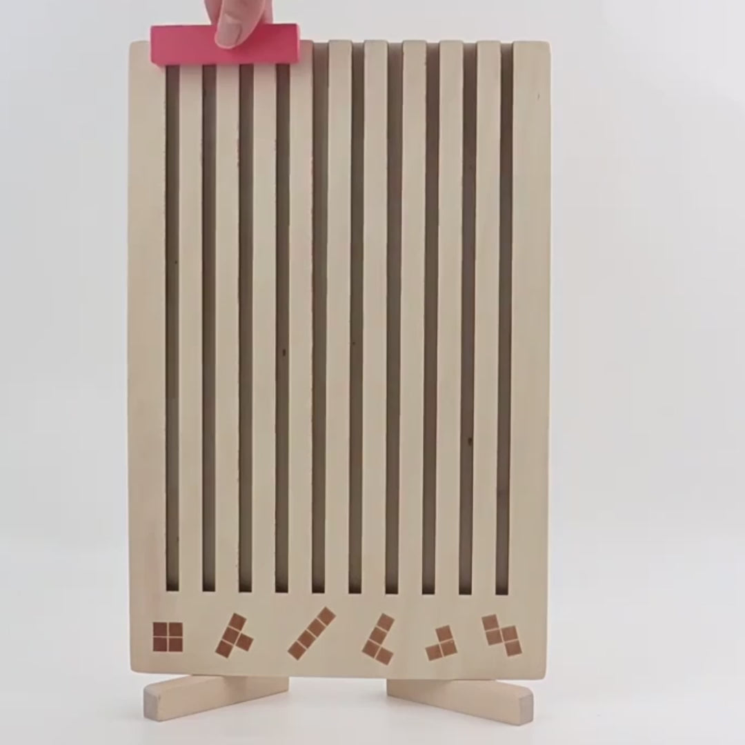 Kids build spatial awareness by arranging Tetris style blocks in vertical slots, learning structure, orientation, and visual planning that support early logic and problem solving.