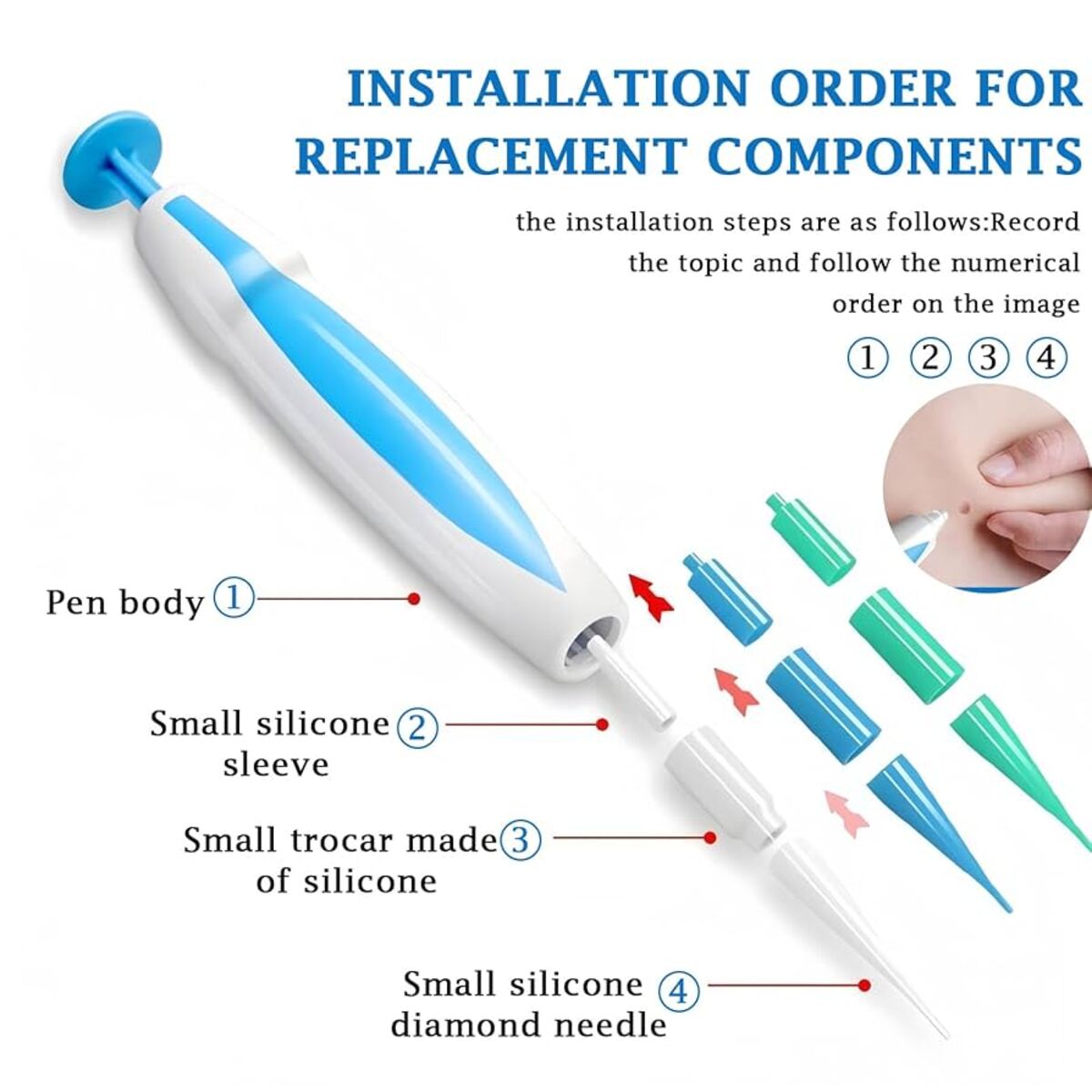 Using soft rubber ligatures the pen blocks blood flow to the skin tag so it darkens and dries. Tags typically fall off in about 5 to 14 days while the skin heals naturally.